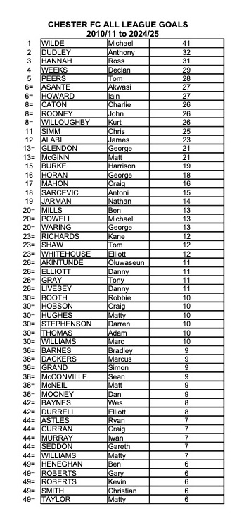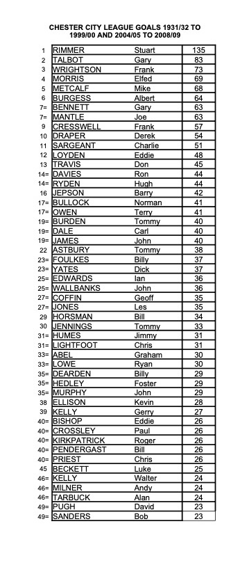 Having listed the top 50 appearances for Chester in the Football League along with Chester FC since 2010 it seemed reasonable to list the top 50 goalscorers during the same period.
