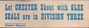 Following promotion the Observer went into overdrive and produced the classic “Let Chester Shout With Glee Seals Are In Division Three”. Possibly the last time the word glee was used in any sentence until the recent television programme salvaged the word from obscurity.