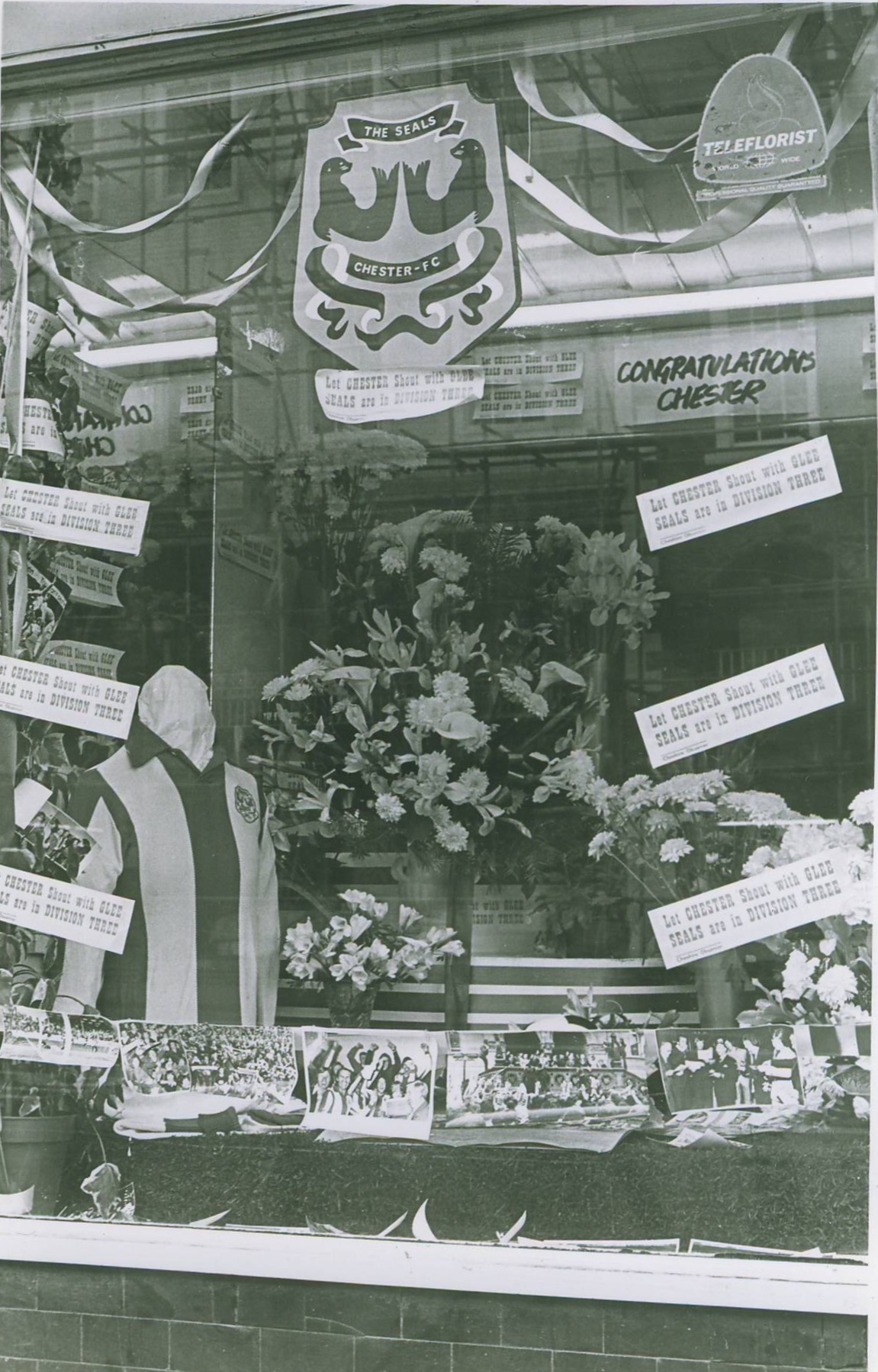 Chairman Reg Rowlands went to town with the stickers following promotion by proudly displaying a selection in the window of his florist’s shop in Bridge Street along with other memorabilia.