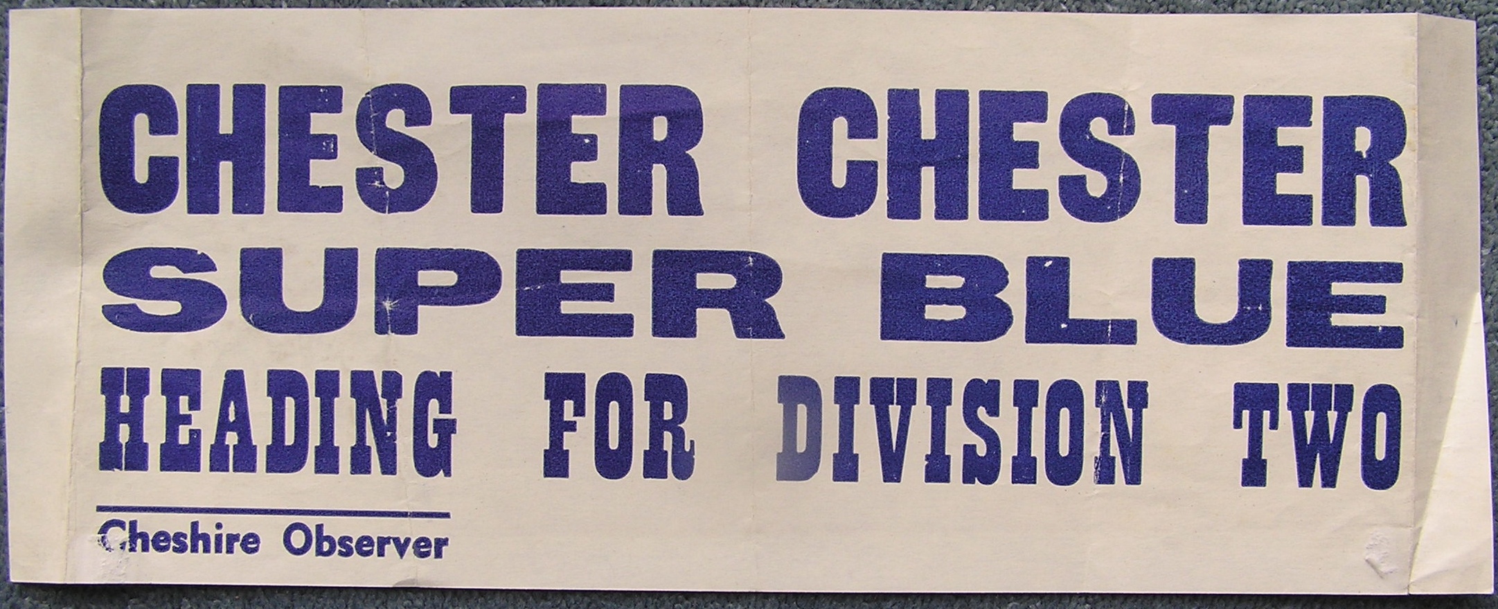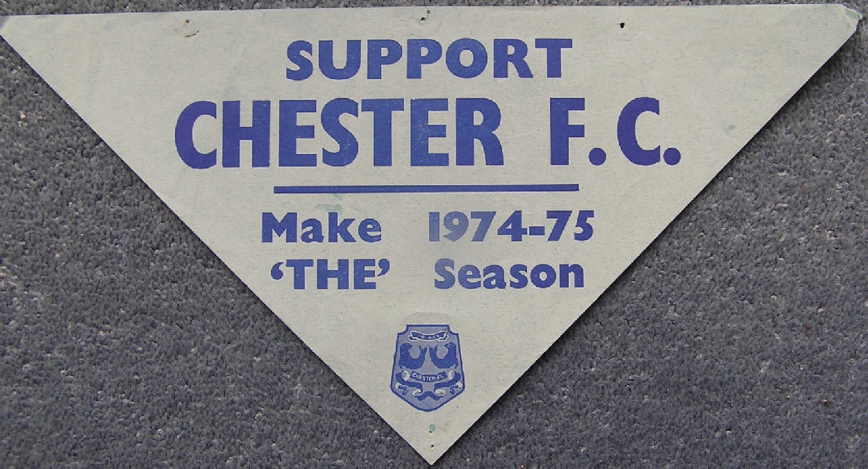 I seem to remember that the very first one was launched during summer 1974 and have a vague memory of the Cheshire Observer asking readers what the phrase “Chester 3-4-5′ meant. At the time there was no indication that the phrase was linked to Chester FC so I don’t think anyone initially had any idea what on earth it was all about. For those still unsure it meant Chester for Division Three 1974/75. It may make vague sense now but it certainly seemed obscure when it was introduced. I haven’t got an example of the Chester 3-4-5 sticker but if anyone else has got one I’ll add it to the piece.
