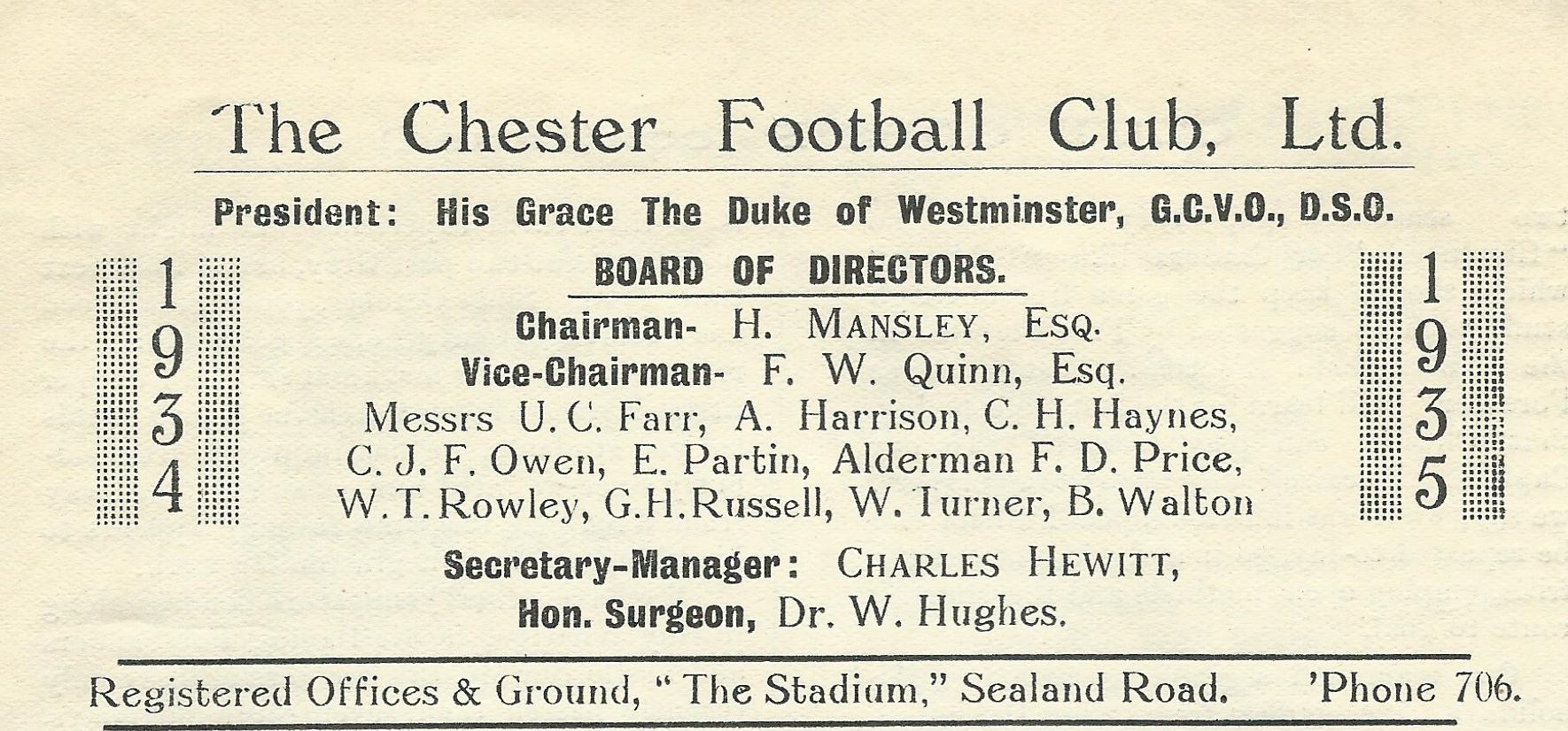 “Sec-manager recommended the ground be given a name such as “The Stadium”, Sealand Road, Chester. Resolved on the suggestion of Mr C.J.F. Owen that the Chairman and Sec. Manager use the words The Stadium on posters and letterheads when the public would would follow the lead and accept the title.”