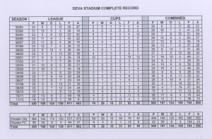 As promised, for those of you who like poring over dull statistics, here is the complete record at the Deva Stadium following the 2-1 victory against Mickleover Sports on Saturday. The row and column headers should be self-evident.