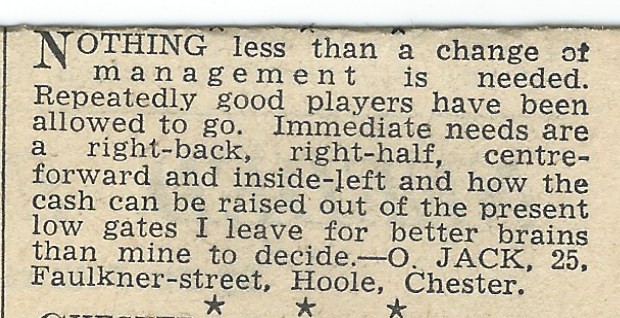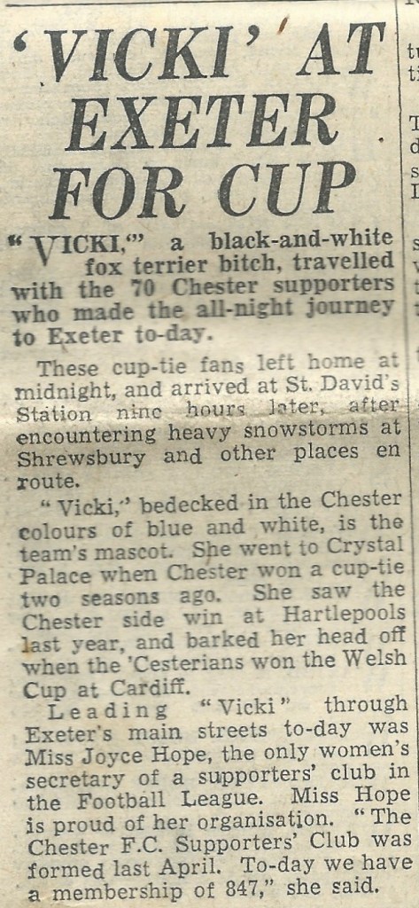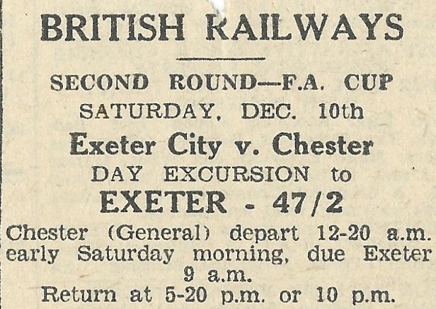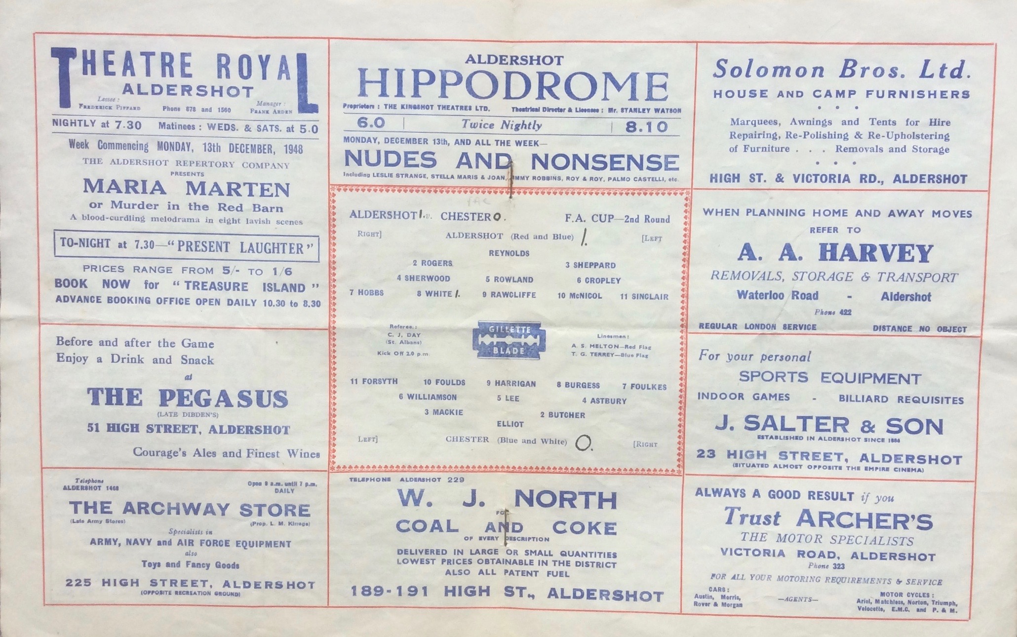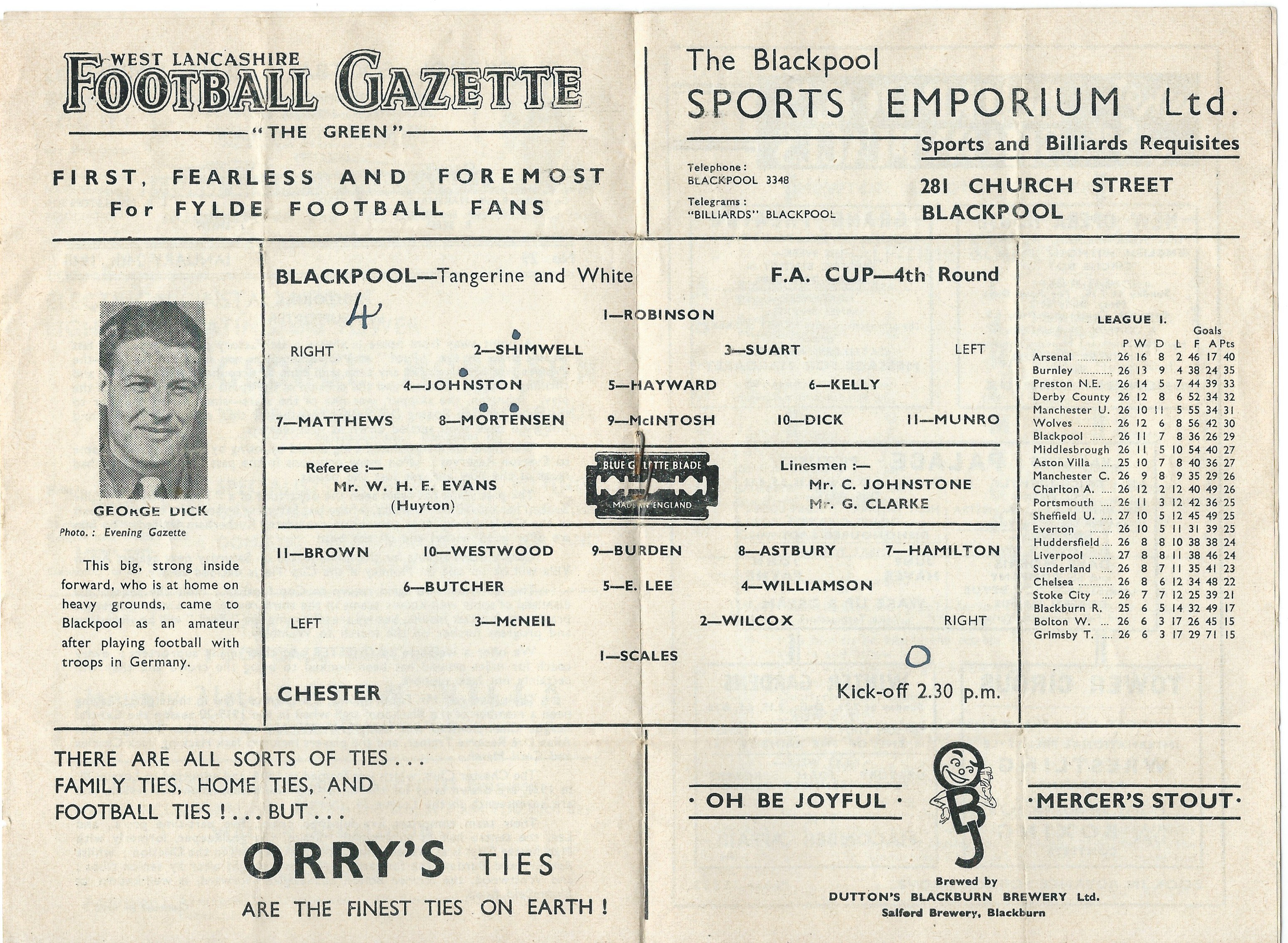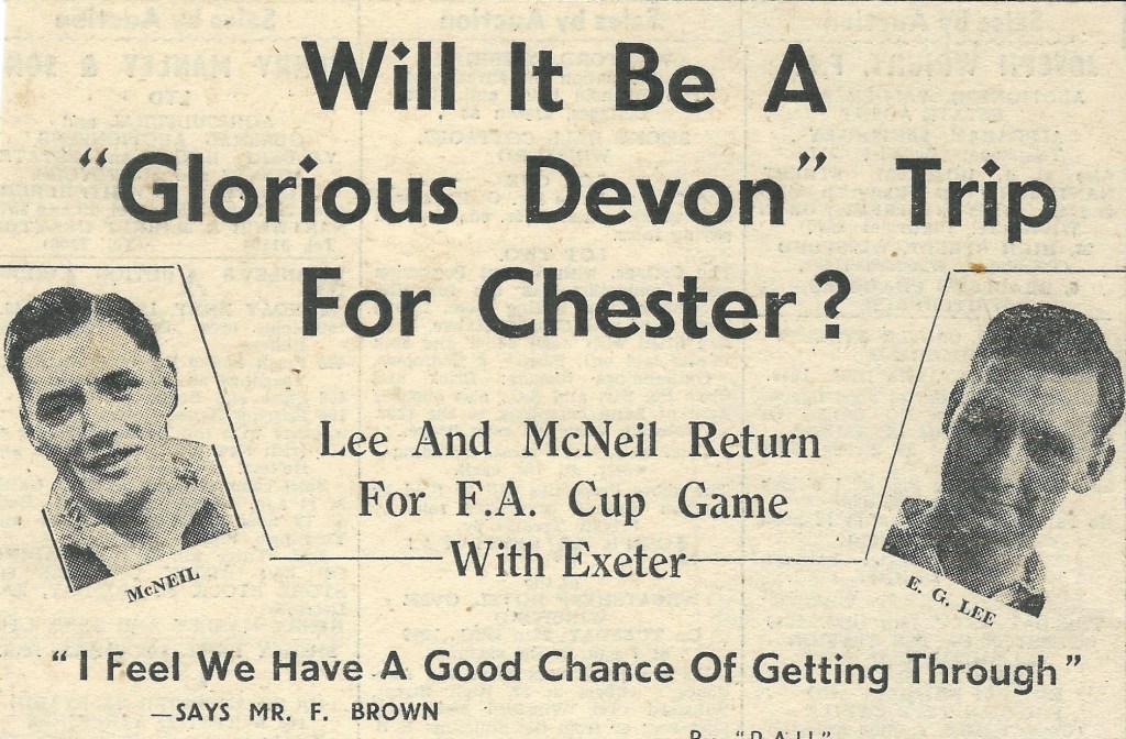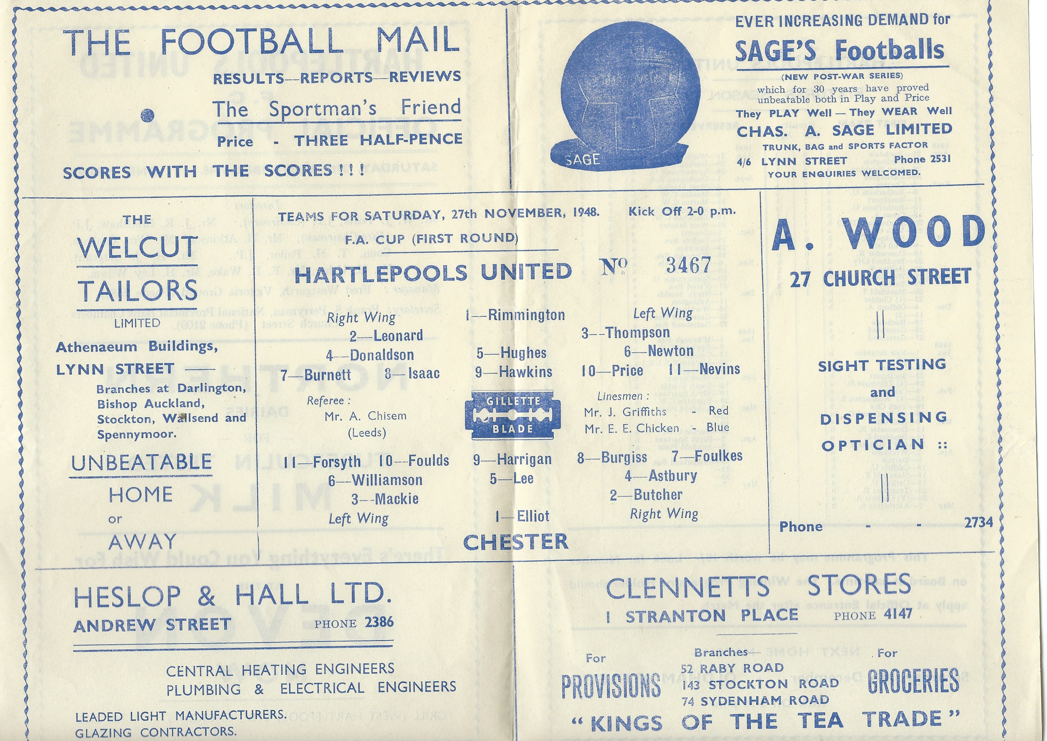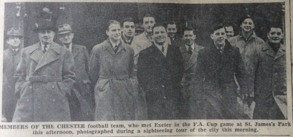 Chester’s defeat cost them a meeting with the man who had lead them into the Football League in 1931. Charlie Hewitt had moved to Millwall after leaving Sealand Road in 1936 and the London side were drawn against Bradford in the 2nd Round. Hewitt’s side went on to win this encounter after a replay. In the league Bradford climbed to 6th place, seven places above Chester who struggled to maintain any consistency and neither troubled the top or bottom of the table.
