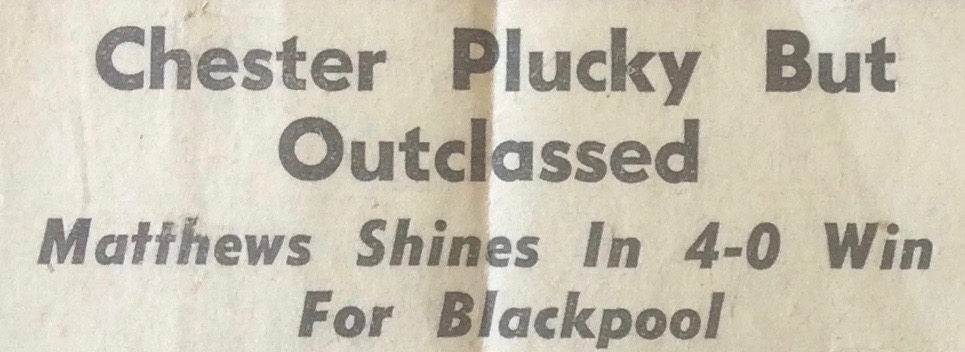 Bradford’s outstanding player proved to be outside-left Billy Elliott who caused problems all afternoon with a brilliant exhibition of wing-play which right-back John Molyneux could not match. While an uncoordinated Chester defence struggled to cope with a potent Bradford strike force the visitors proved stubborn at the opposite end with centre half Les Horsman particularly dominant. Wingers Devonshire and Foulkes were arguably Chester’s best forwards but they lacked service with neither Burgess and Hankinson being particularly effective. Wing-backs Tommy Astbury and Peter Greenwood were not as impressive as usual and Coffin should have scored more than one goal had he displayed more steadiness.