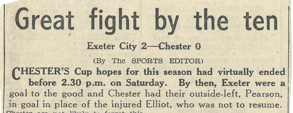 In the 29th minute Bradford capitalised on Chester’s failure to extend their advantage when the ever dangerous Billy Elliott came inside to head a Bill Deplidge cross past Threadgold. Chester had the perfect opportunity to regain the advantage on the stroke of half-time when Arthur Wheat was harshly adjudged to have handled the ball. Hindle was the man who stepped up to take the penalty but his weak effort passed wide of the post. The decision to hand responsibility to the normally reliable full-back was questioned by the Chester Chronicle who pointed out that this was his first ever penalty kick.
