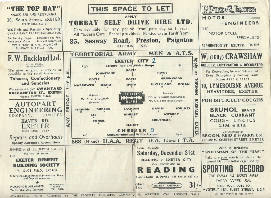 Unfortunately Chester had failed to build on their commanding performance league win against Bradford. It had been followed by a 3-1 defeat at top of the table Tranmere and then a dismal home showing against Barrow resulting in a 2-1 setback. Frank Brown had boldly experimented by playing three centre forwards against Barrow. Ralph Morement, Tommy Tilston and Geoff Coffin had all donned the number 9 shirt during the campaign but the experiment failed to pay off as Chester wasted a host of chances to give the visitors their first away win of the season.
