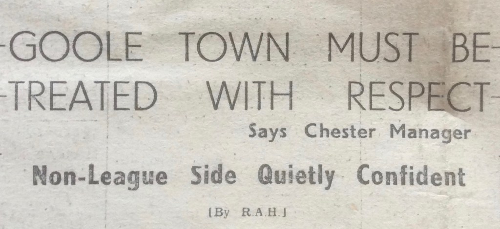 Remarkably, the Chester tie was scheduled to be Goole’s 10th in the competition that season with four of their Qualifying Round ties needing replays. Having comfortably beaten Barton Town in the Preliminary Round they had needed replays to dispose of Frickley Colliery, Bentley Colliery, Brodsworth Main and Scunthorpe.